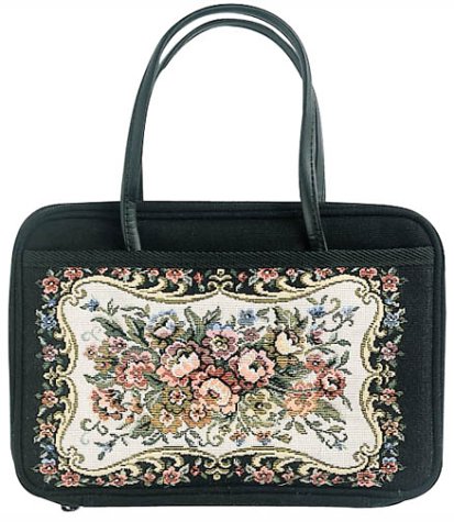 Classy Victorian needlepoint design features inspiring artwork in a fashionable theme making this a delightful choice for protecting a book or Bible. The interior features a protective lining and has two pen/pencil holders. Two exterior pockets and fabric purse handles complete the design.